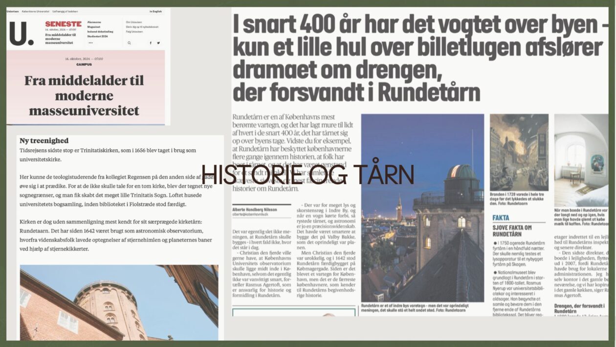 I 2024 har Rundetaarn gjort sig bemærket i både trykte medier, på lyd og i billeder. Alle særudstillinger har fået et par ord med på vejen, ligesom events som Stjernebar, Kulturnatten og morgensang er blevet omtalt. Her er nogle af de mest bemærkelsesværdige presseklip: