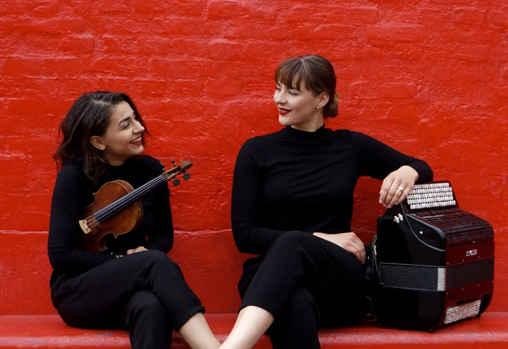 I koncerten “Folkemusik på flugt” fortolker Duo MiScha den armenske folkemusikalske verdensarv i egne klassiske arrangementer. Violinisten Astrid Mikaelyan, armensk flygtning, og akkordeonisten Julie Holmegaard Schade væver musik og fortællinger om tab, længsel og håb. Duoen spiller med krop, mimik og musikalsk indlevelse, og aftenens publikum vil kunne mærke Mikaelyan og Schades kærlighed for at formidle folkelige elementer i klassisk musik.